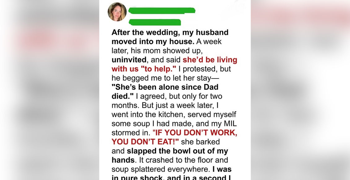 After the wedding, my husband moved into my house. A week later, his mom showed up, uninvited, and said she’d be living with us “to help.” I protested, but he begged me to let her stay—“She’s been alone since Dad died.” I agreed, but only for two months. But just a week later, I went into the kitchen, served myself some soup I had made, and my MIL stormed in.