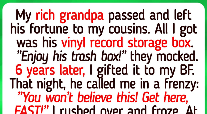 My rich grandpa passed and left all his fortune to my cousins. All I got was his old vinyl record storage box. “Enjoy his trash box!” they mocked me.